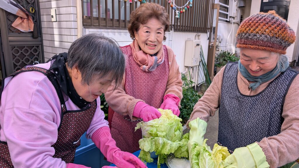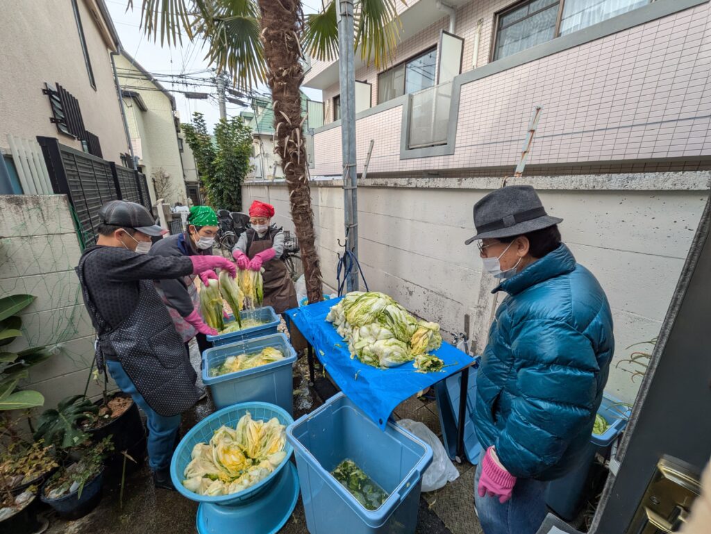 長年の経験から生まれるお年寄りの手さばきで味付けの加減を教えていただき、ボランティアの皆さんは白菜を洗ったり漬けたりしながら、そばで力強く支えてくださいました。役割を分担しながら、自然と笑顔と会話が広がるひとときとなりました。